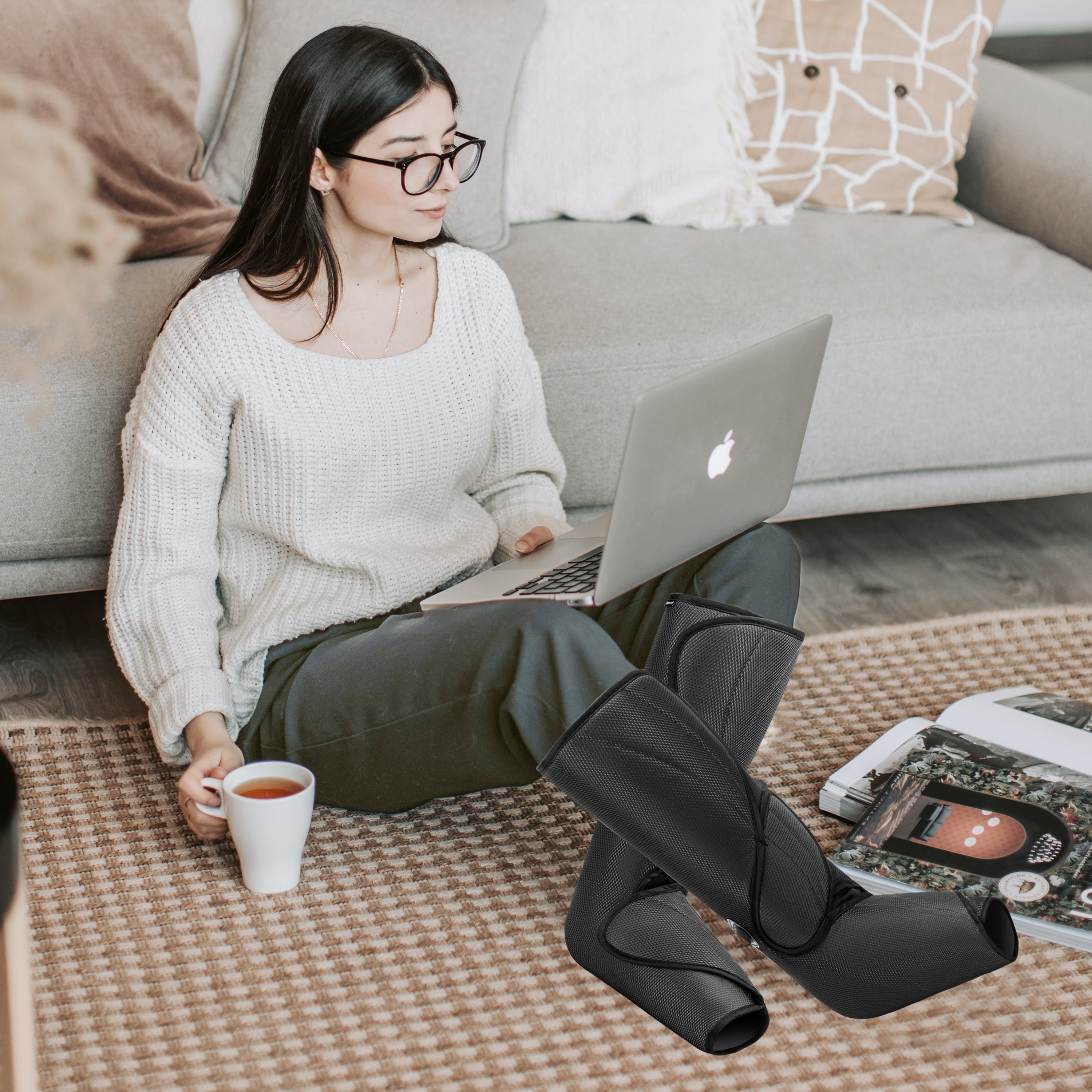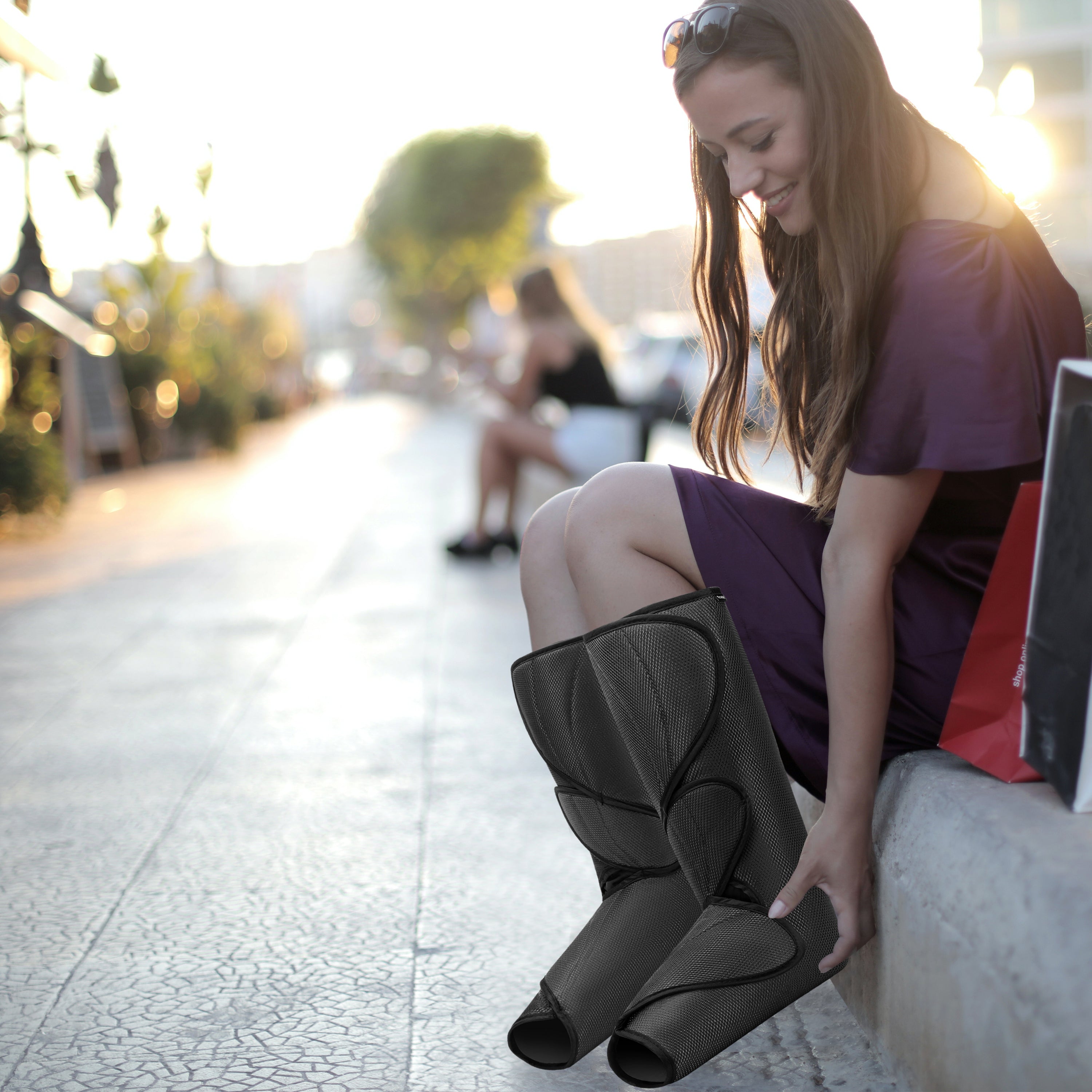 Sit in a comfortable chair and slip your legs and feet into the massager boots like putting on a pair of boots.